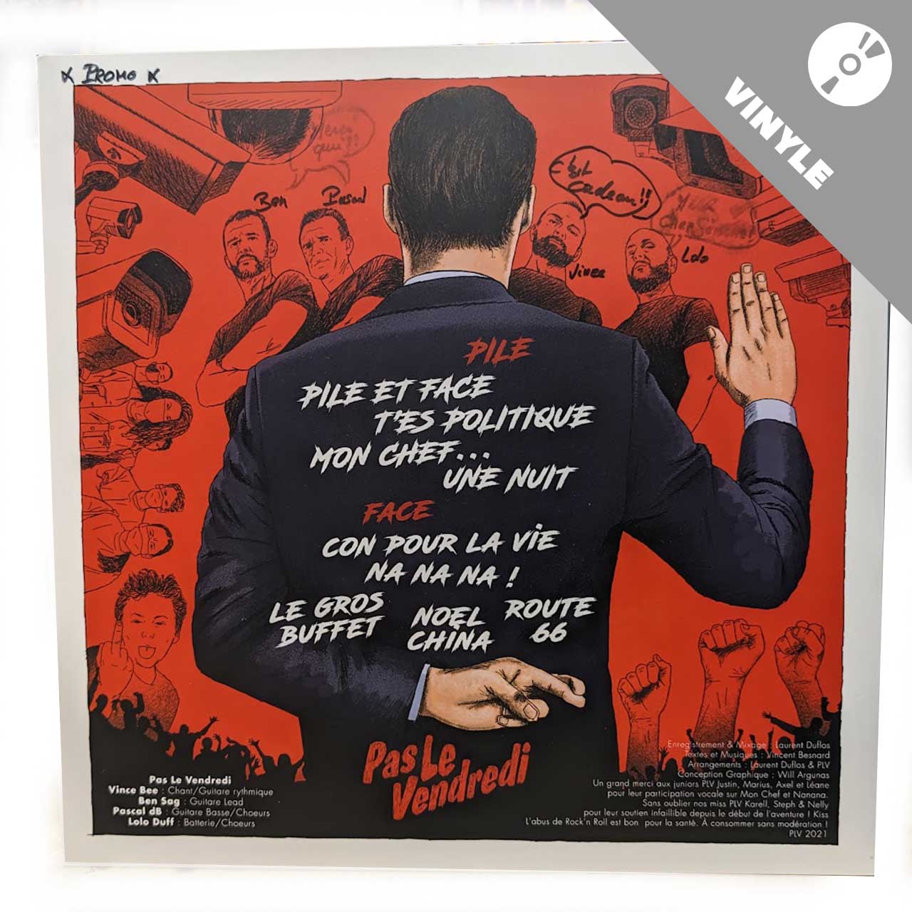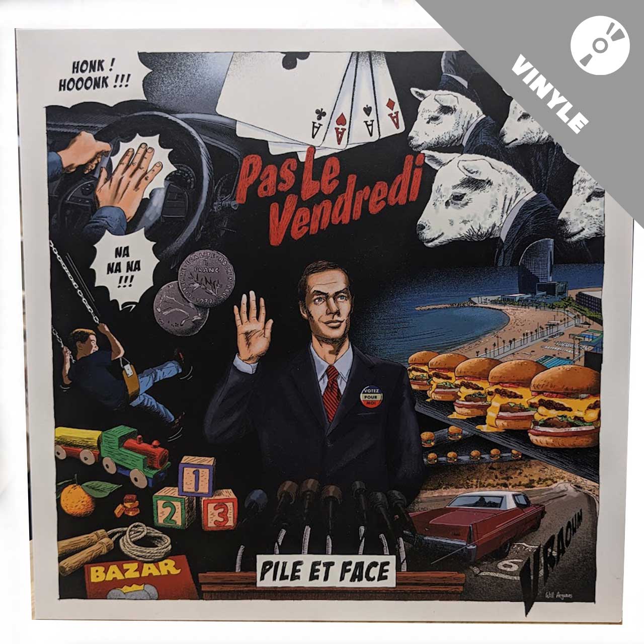 La version vinyle du 3ème opus « Pile Et Face » du groupe Sarthois PAS LE VENDREDI sortie en décembre 2023 des presses vendéennes de chez B-Side Factory. Toujours 100 % auto-produit par la bande de potes de PLV qui affirme encore son identité musicale bien trempée ! Pour cet album, la réalisation graphique de la pochette a été confiée à l’artiste BéDéiste français Will Argunas.